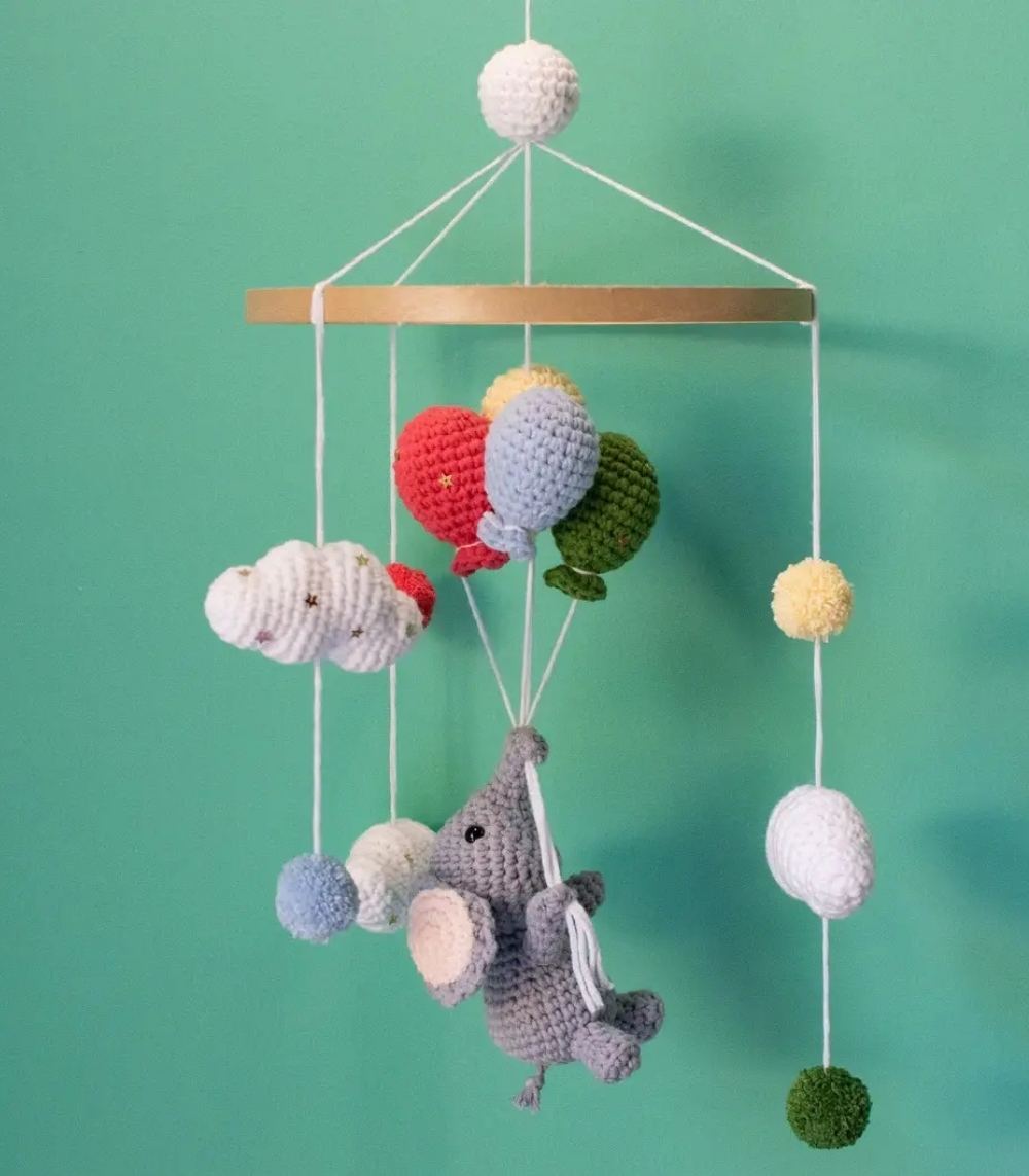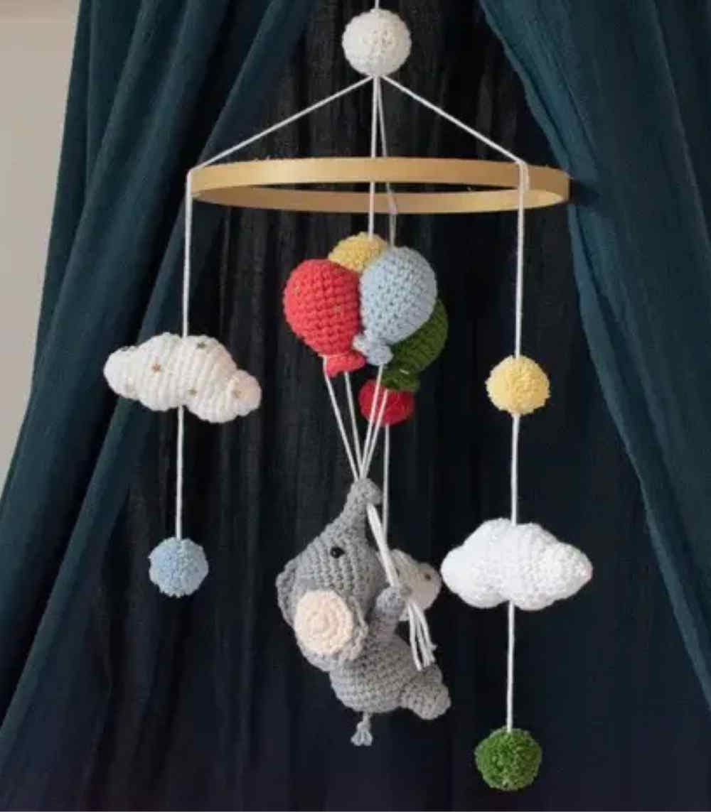 Every part of the mobile is crocheted by hand—from the plush elephant to the balloons and clouds. As the mobile gently sways, it catches your baby’s eye and brings a sense of calm through slow, smooth motion.