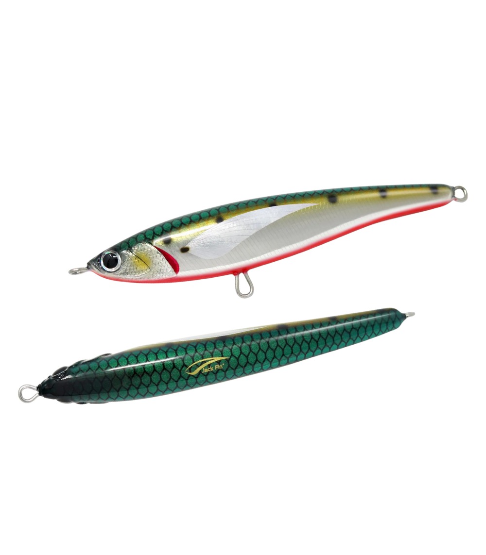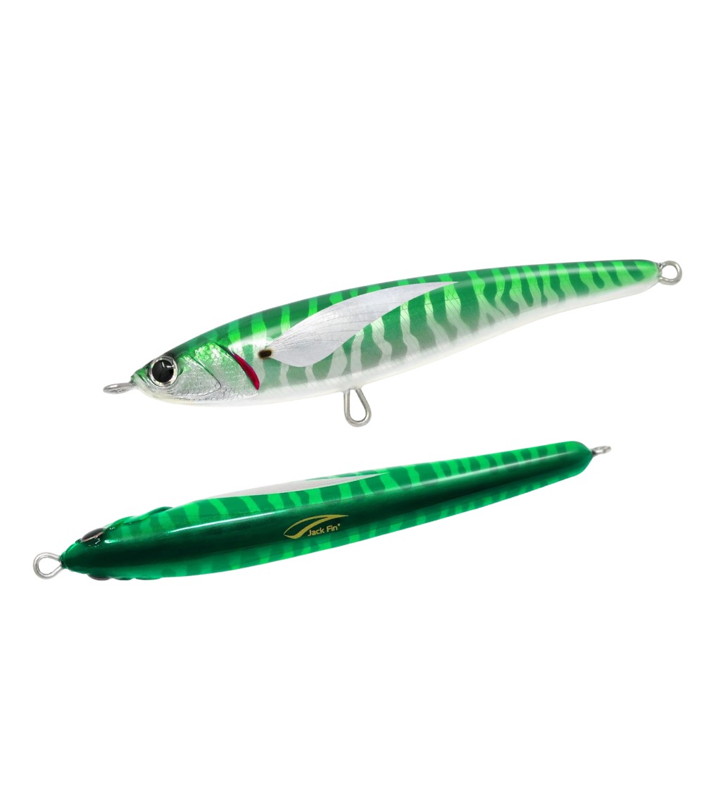 The Jack Fin Pelagus 165-S is a specialized sinking stickbait engineered specifically for Bluefin Tuna fishing. It features a distinctive “wobbling” action during the sinking phase that attracts tuna from long distances, making it highly effective for both feeding frenzies and targeting apathetic fish hunting small forage.