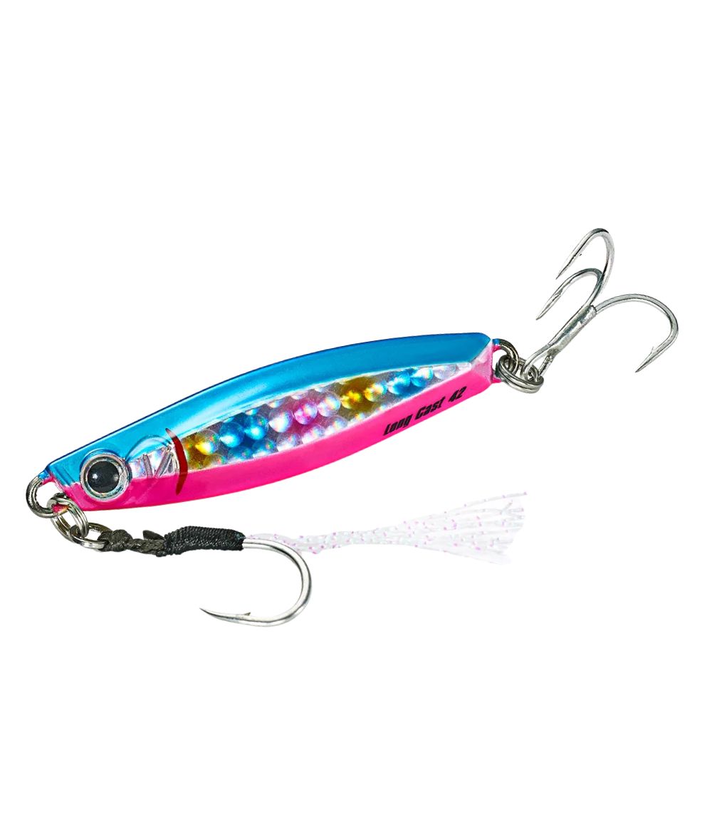 Its cross-section body shape and dented surface design enhance lure stability during both casting and swimming, while the flat-sided profile produces strong flashing underwater—imitating baitfish scales and triggering reaction strikes from aggressive predators. With a steady sinking action and tuned hook sizes by model, the Long Cast is a dependable option for saltwater shore jigging and light offshore fishing.