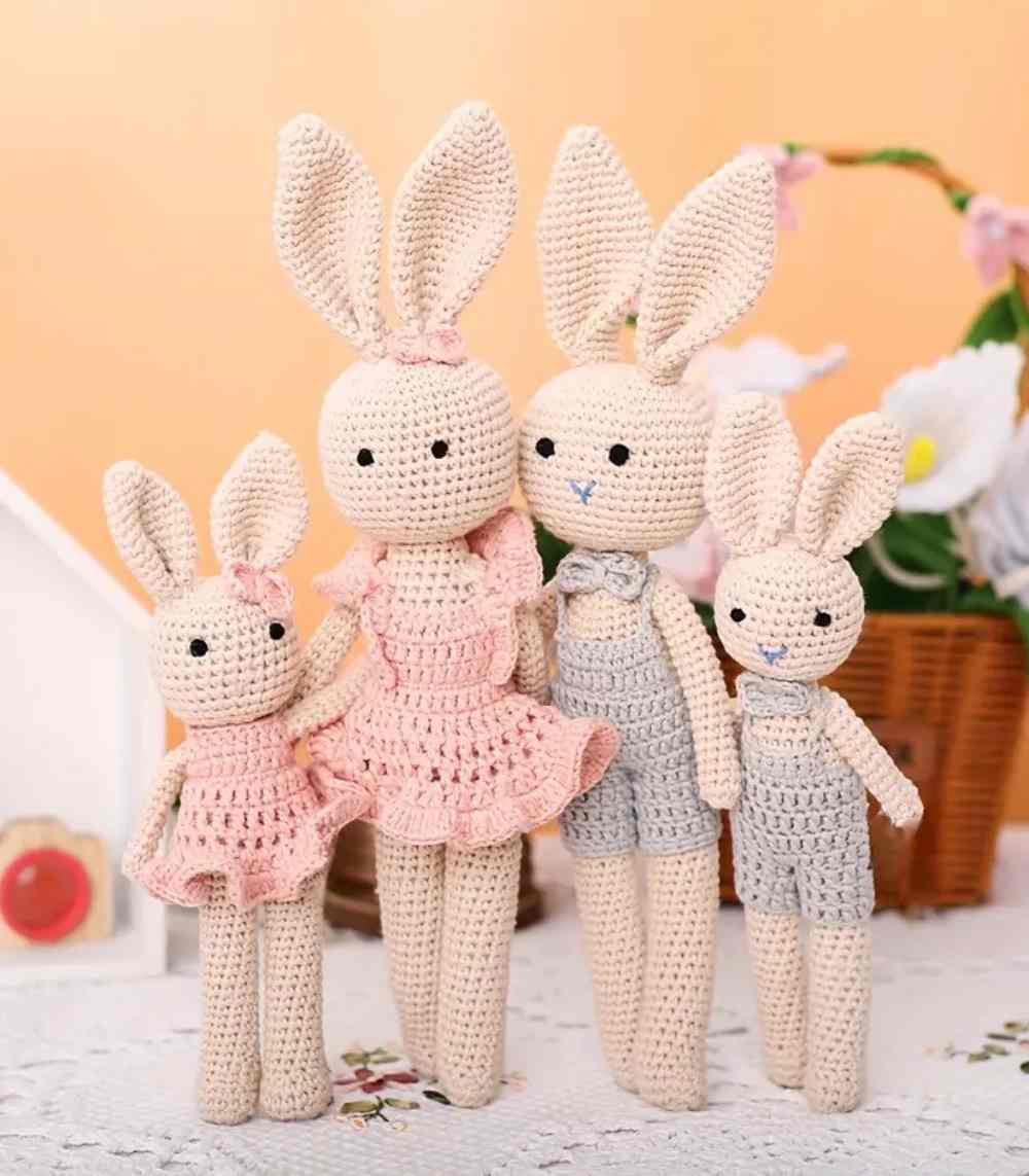 Discover the warmth and charm of the Myrtilus Crochet Bunny Family Set a thoughtfully crafted 4-piece collection made from 100% cotton yarn and filled with soft PP cotton. The set includes two 22 cm and two 32 cm bunny dolls, perfect for imaginative play, nursery decoration, or meaningful gifting.