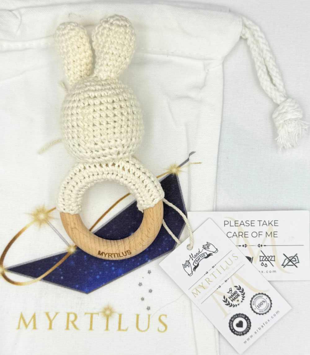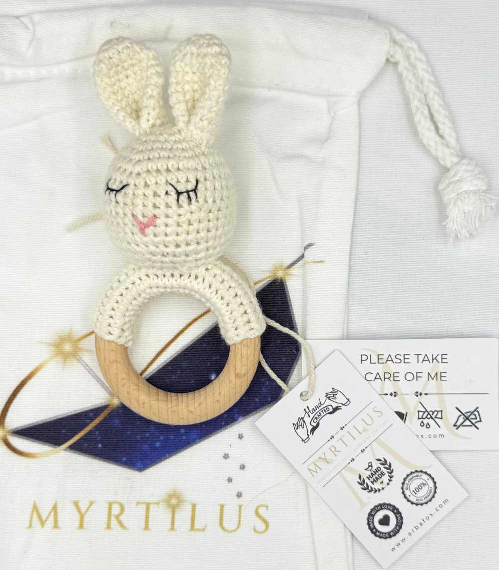 Myrtilus Crochet Bunny Rattle Teether – Handmade in Cotton