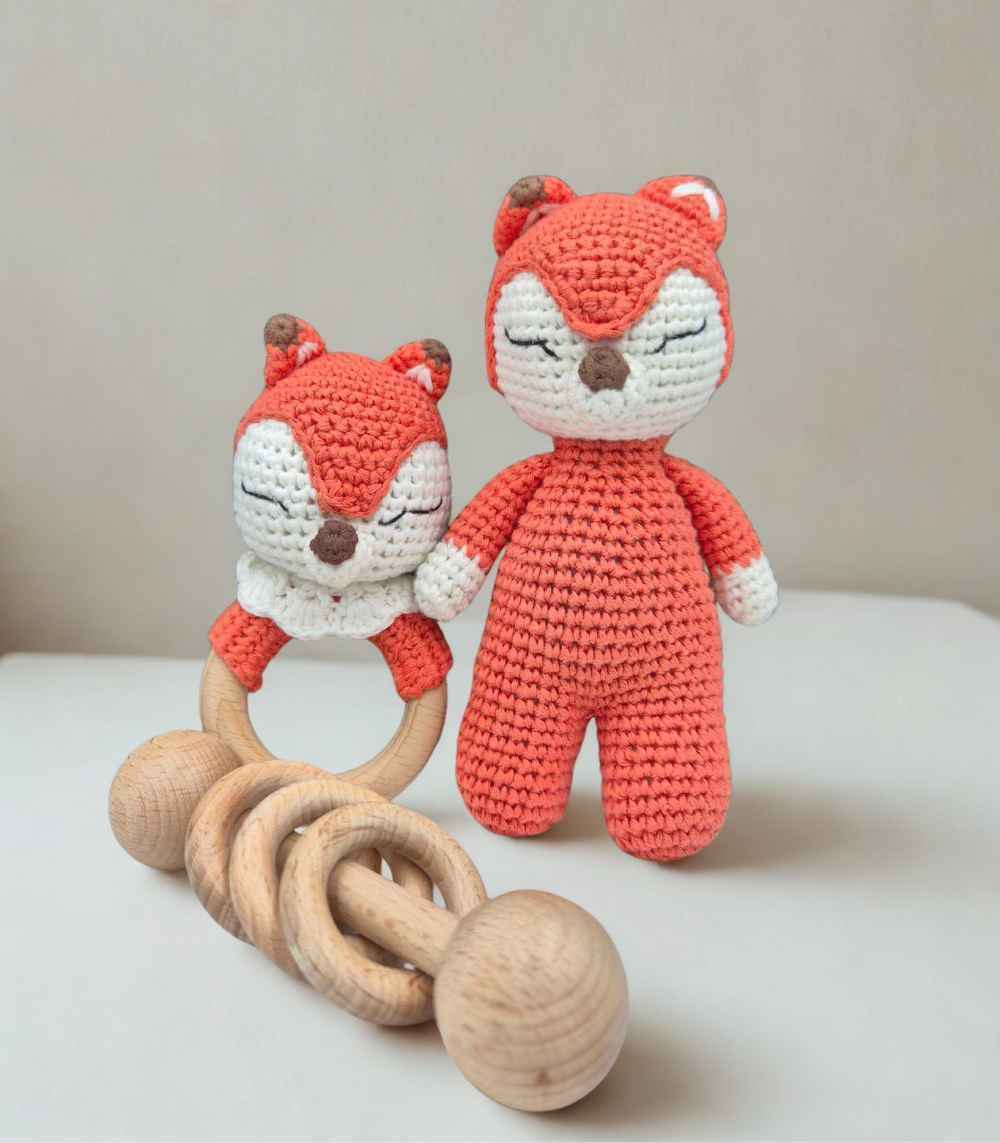 Add cozy woodland charm to your baby’s playtime with the Myrtilus Crochet Fox Teether Gift Set – Handmade in Cotton . This 3-piece bundle includes a soft crochet fox plush, a wooden teether ring with a fox face, and a smooth, gentle rattle—each made for safe and soothing play.