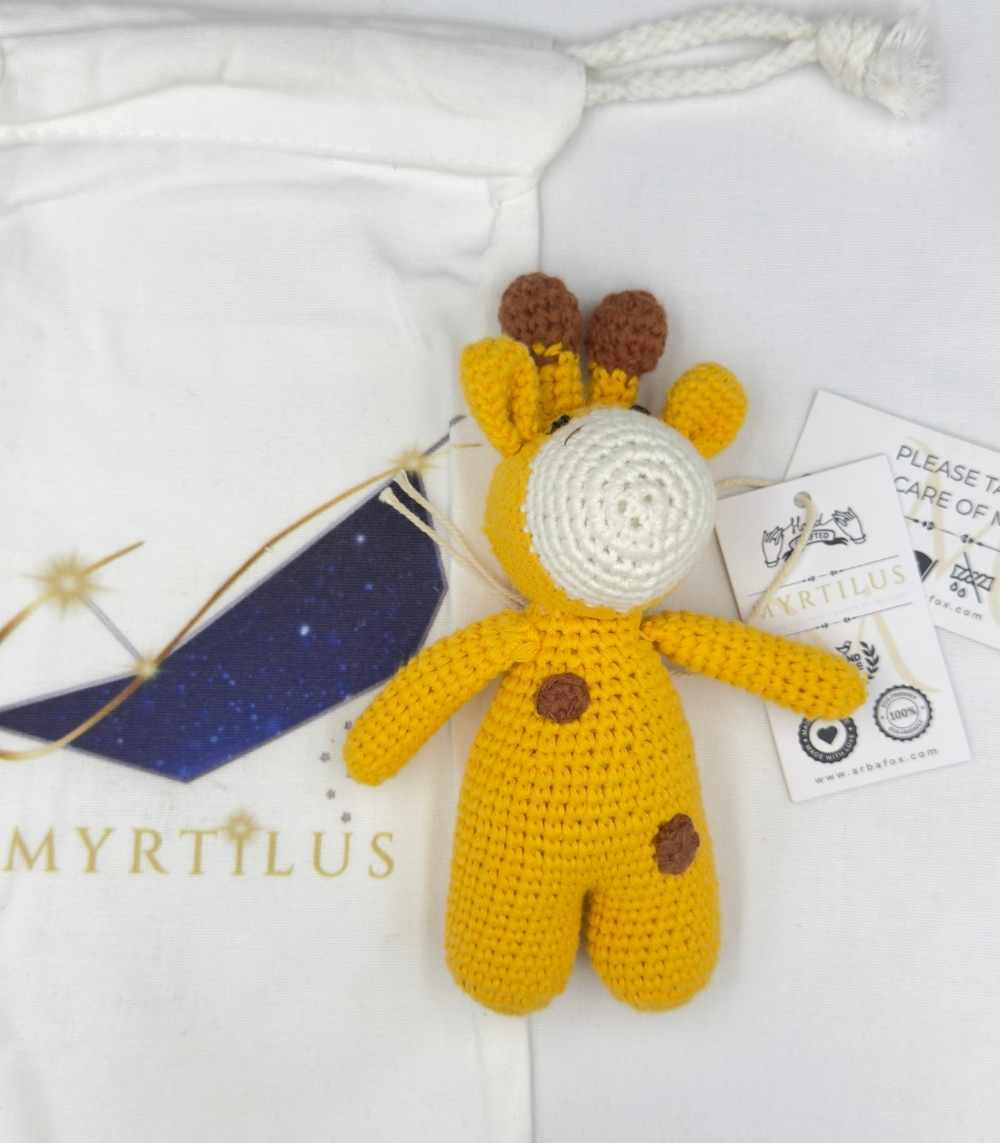 Every giraffe arrives in a reusable Myrtilus cotton pouch—an eco-friendly, gift-ready presentation.