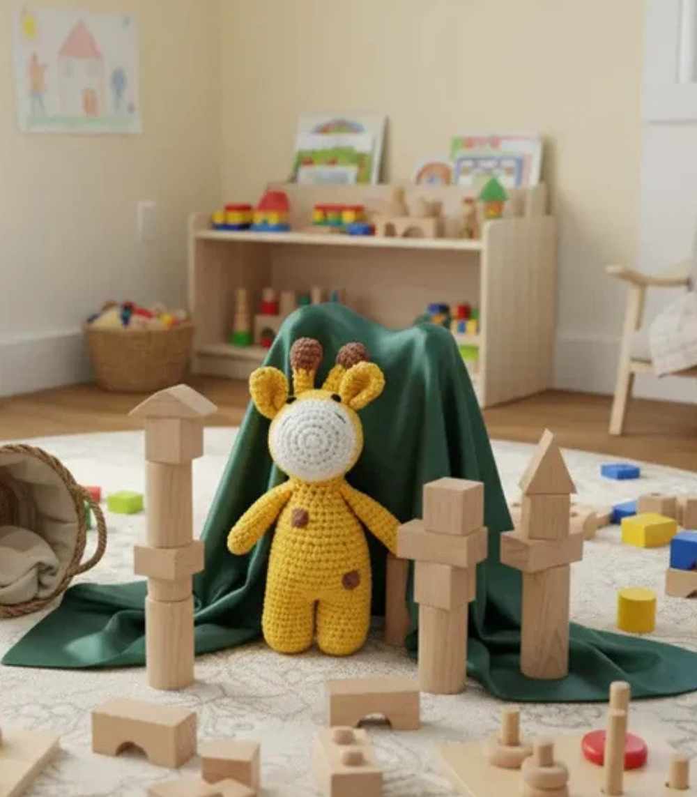 This crochet giraffe features a tall, gentle form and a kind expression. It adds warmth and personality to nurseries, playrooms, and gift sets.