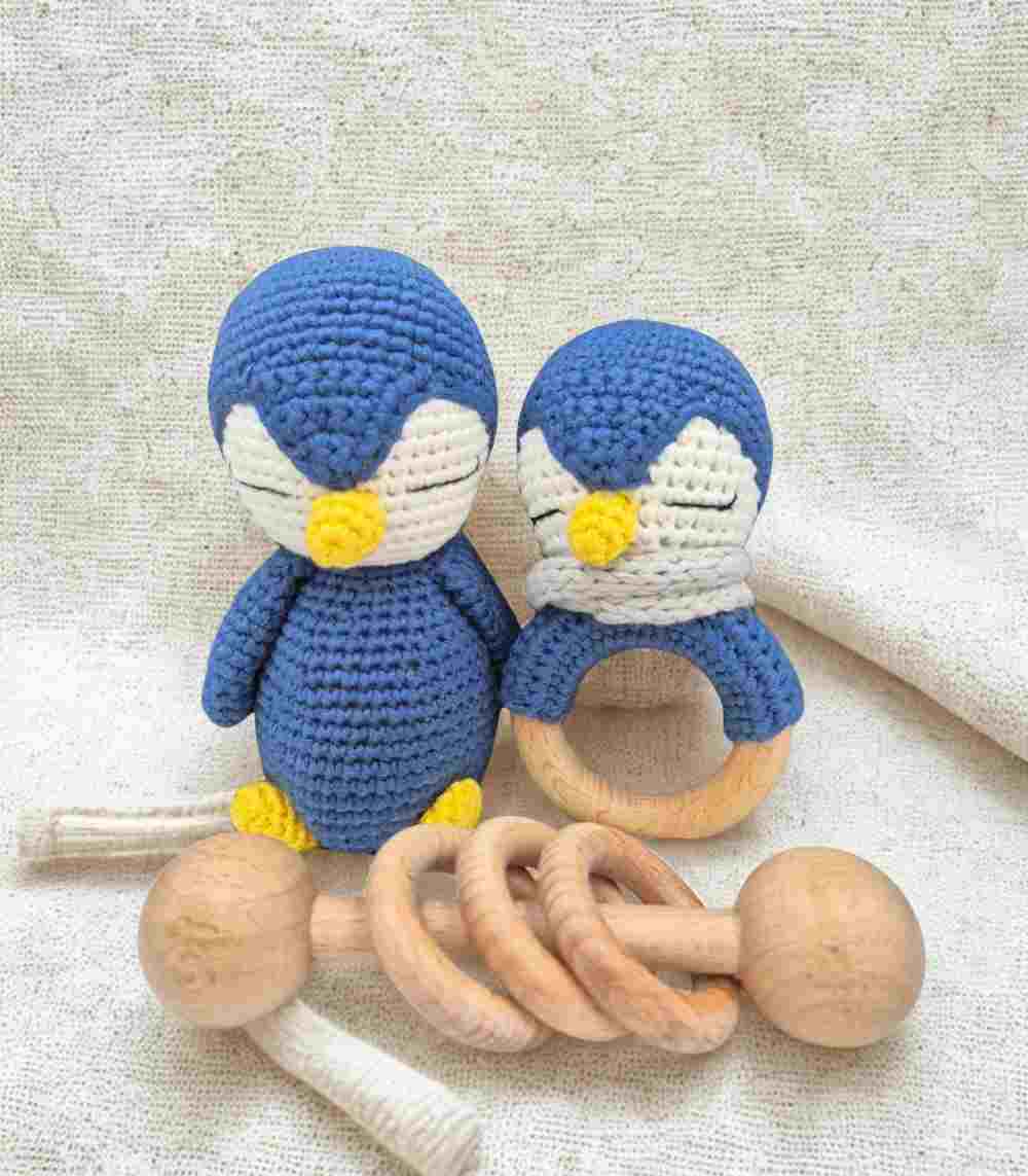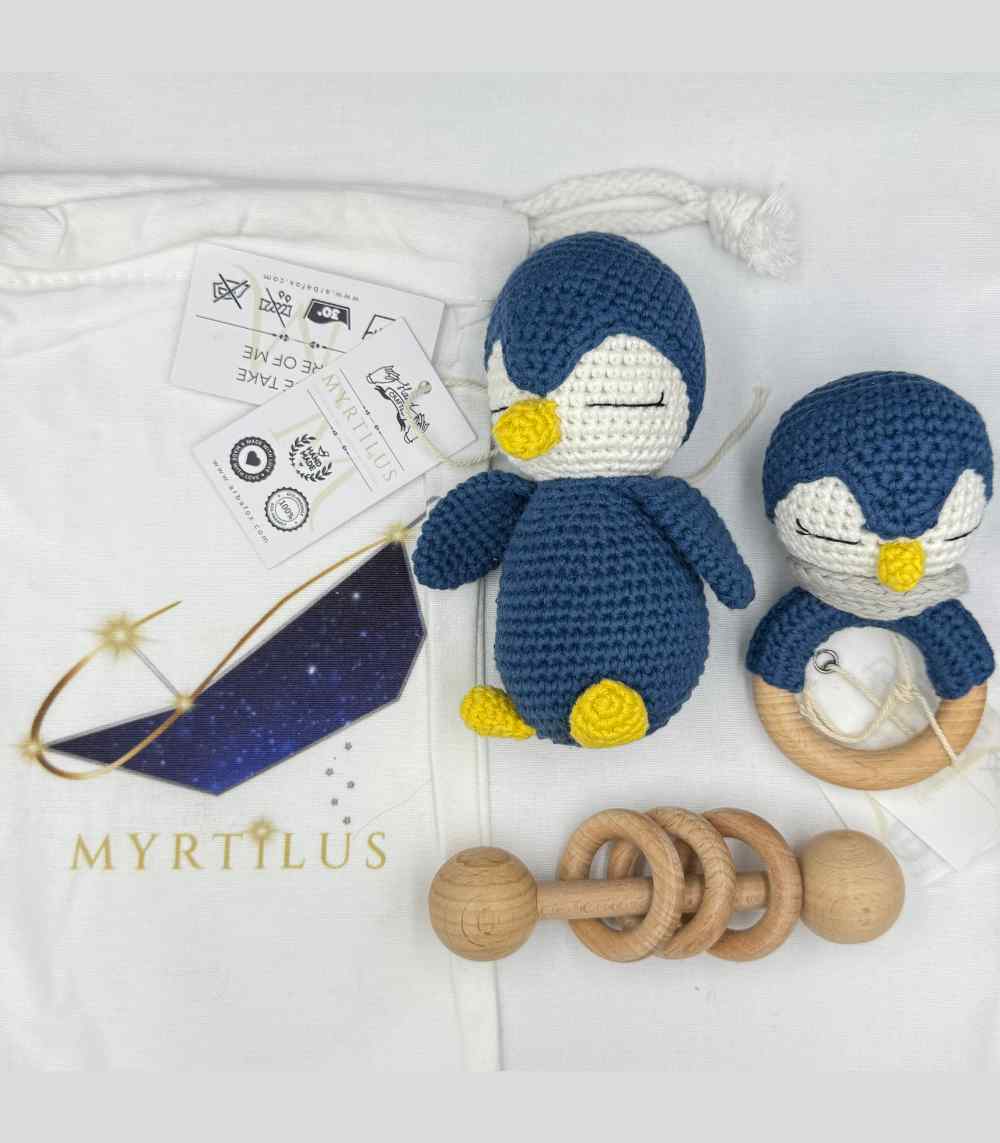 Delight little ones with the Handmade Penguin Teether Gift Set by Myrtilus. This 3-piece set includes a cuddly crochet penguin plush, a soft cotton teether ring with a wooden base, and a smooth wooden rattle—thoughtfully designed for safe, soothing play.