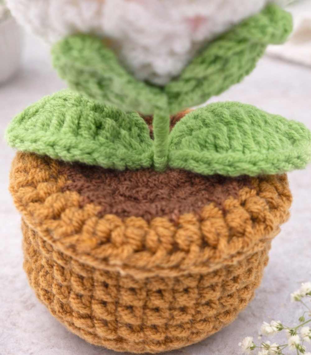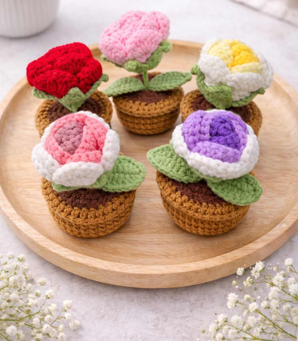 Each rose is lovingly handmade from soft, vibrant acrylic yarn—no watering or sunlight needed.