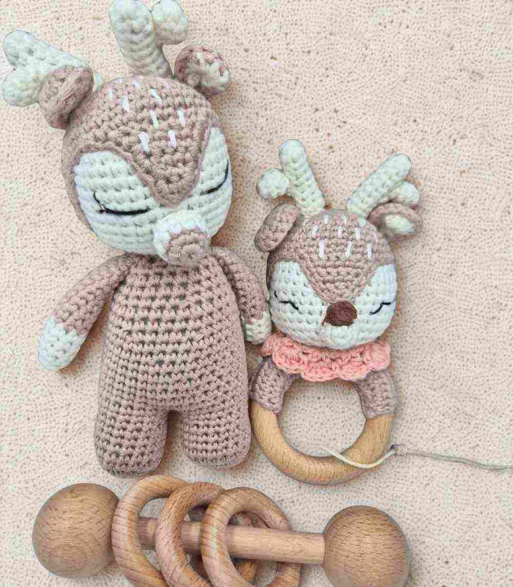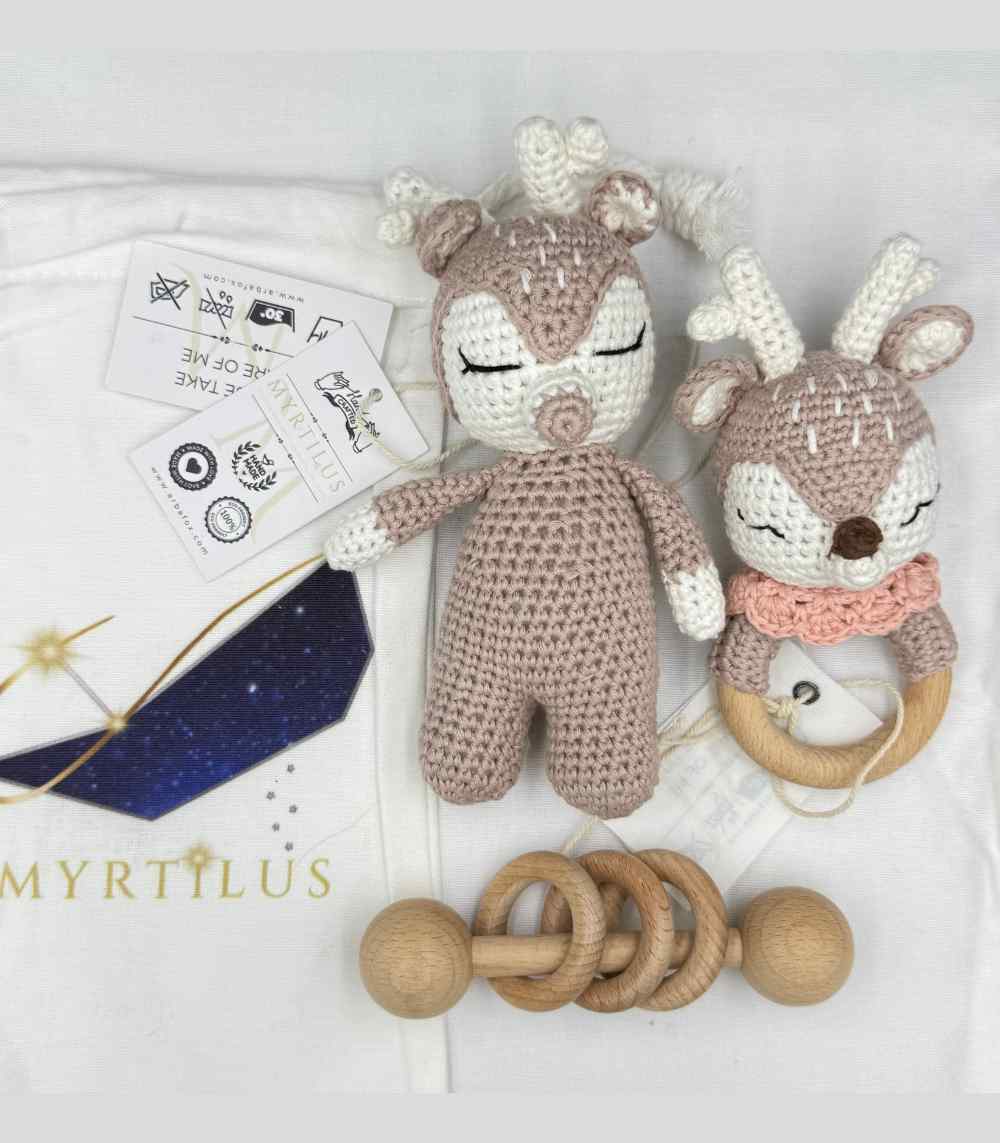 The Handmade Crochet Teether Set by Myrtilus   is a calming, baby-safe trio designed to comfort and engage. It includes a soft deer plush, a gentle wooden rattle, and a crochet teething ring—each handmade from 100% cotton yarn and untreated wood.
