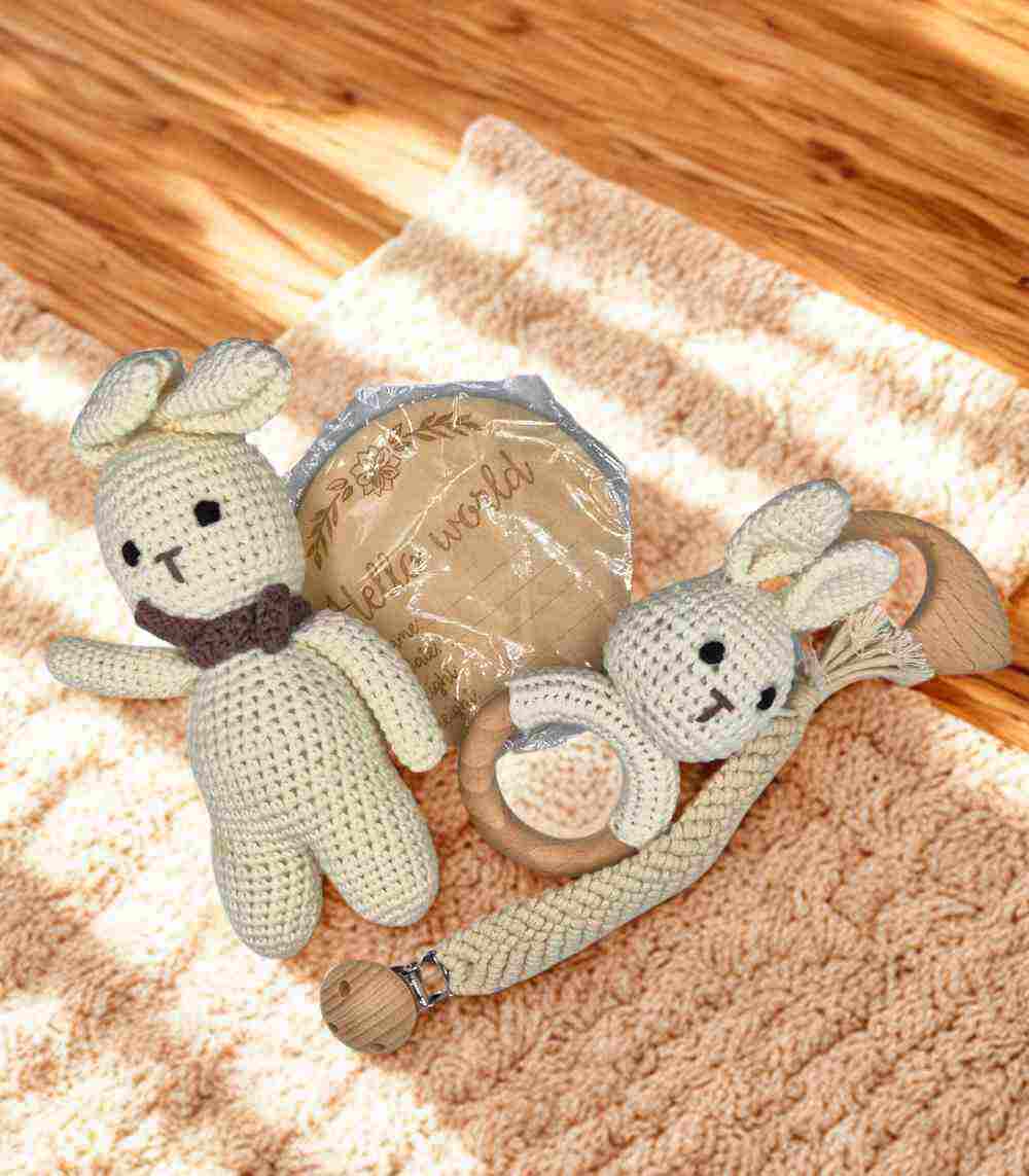 Includes a plush crochet bunny, a wooden teething ring, a gentle rattle, and a milestone card—each created to support comfort, play, and development.