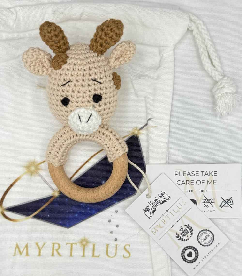 Meet the Myrtilus Handmade Crochet Baby Bull Rattle with Beech Wood Teething Ring—a gentle and cheerful friend made to bring joy and comfort to little hands. With a sweet stitched smile, upright ears, and tiny antlers, this soft Bull is a lovable blend of charm and sensory support.