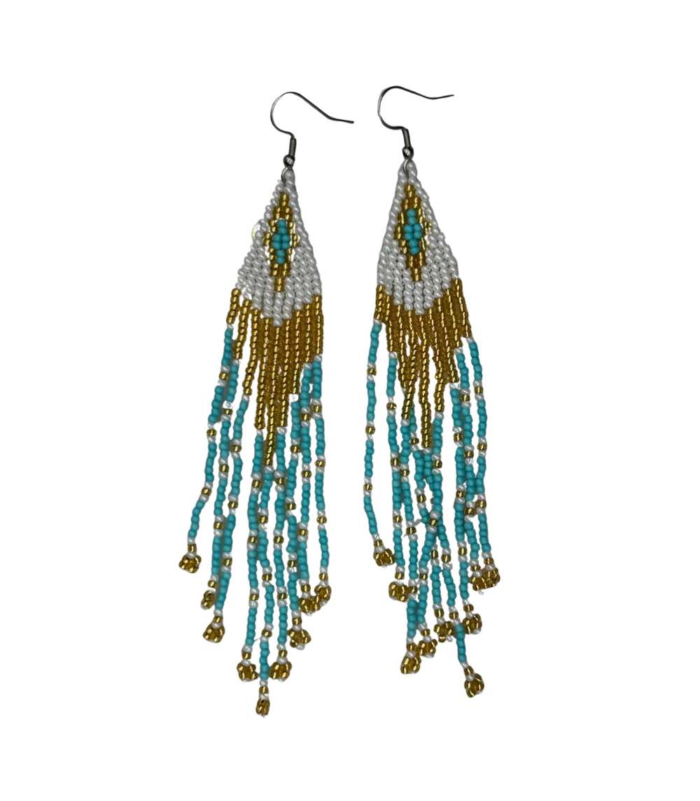 Choose from striking red or serene blue variants, each intricately woven with seed beads and highlighted by soft white and shimmering gold accents. Measuring 13 cm in length and 2 cm in width, each pair is lightweight at just 10 g, ensuring all-day comfort without sacrificing impact.