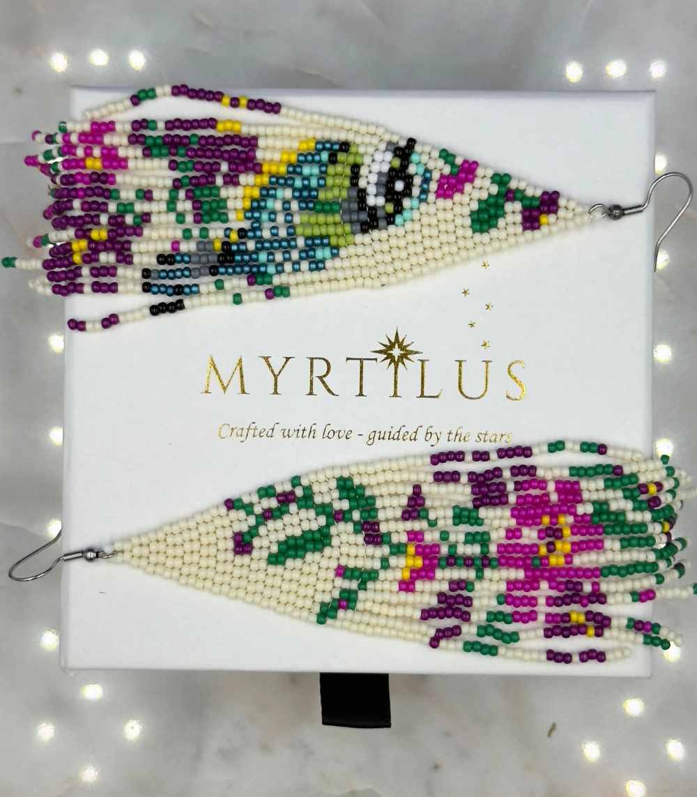 Celebrate artistry and nature with these Myrtilus Lampwork Drop Earrings – Meadow Song & Bloom Trail Beaded Tassel Design, crafted in an intricate Bohemian seed bead style. Each earring is handwoven using traditional techniques, forming a stunning combination of tribal elegance and vintage femininity. The dangling fringe design and embroidered floral elements bring a free-spirited flair to your everyday or statement looks—perfect for lovers of folk-inspired jewelry and handmade craftsmanship.