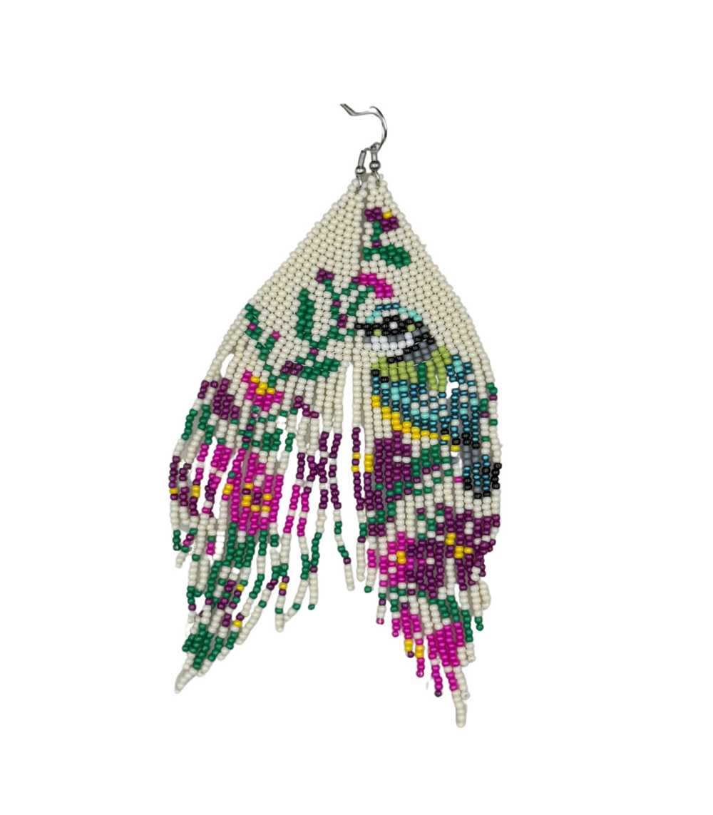 This pair features a charming songbird and bloom pattern, designed with a mix of ivory, teal, pink, wine, forest green, and yellow beads on a soft neutral base. The harmonious color palette evokes blooming meadows and bird song at sunrise, with each tassel trailing gracefully for a flowing silhouette. Measuring approximately 14.5 cm (5.7 inches) long and 4 cm (1.57 inches) wide, the earrings weigh about 16 g (0.56 oz)—bold yet comfortable to wear.