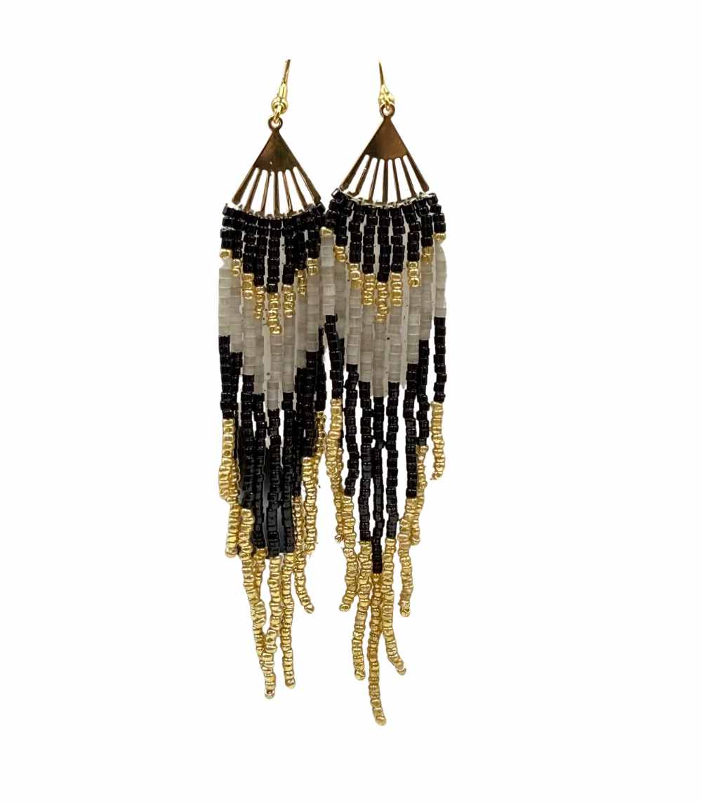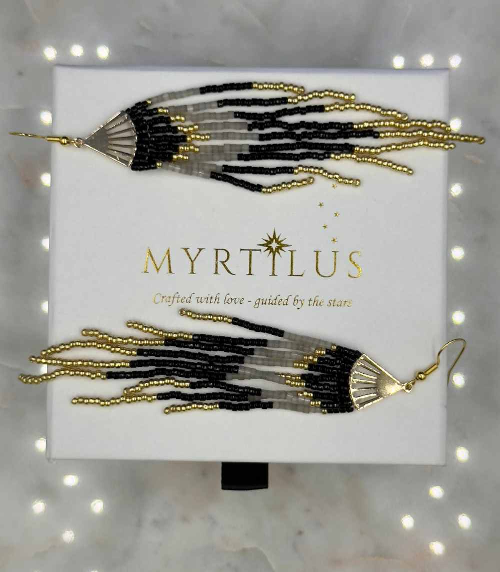 Step into effortless elegance with the Myrtilus Lampwork Drop Earrings – Midnight Chevron & Golden Tassel Design. Crafted in a signature bohemian style using intricate seed beadwork, these earrings combine geometric charm with fringe fluidity, making them a standout accessory for any occasion. Lightweight and bold, they’re perfect for anyone who loves expressive jewelry with artisan flair.