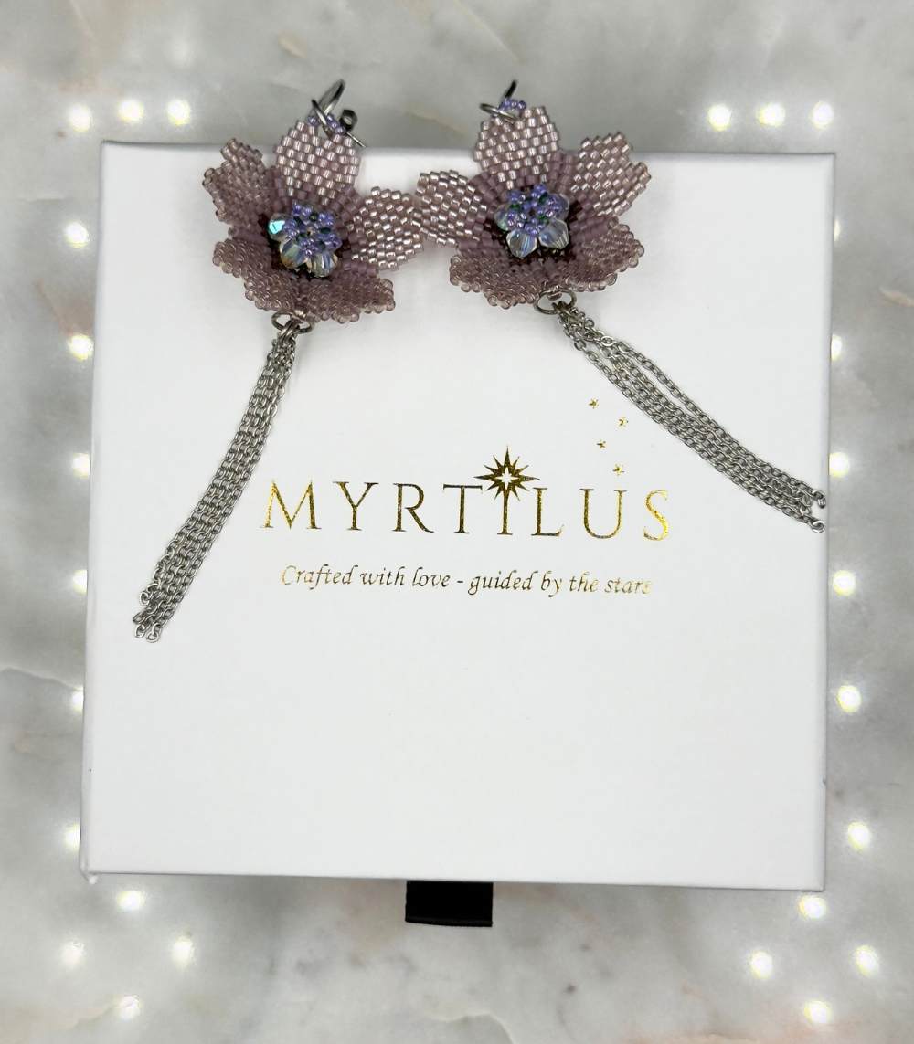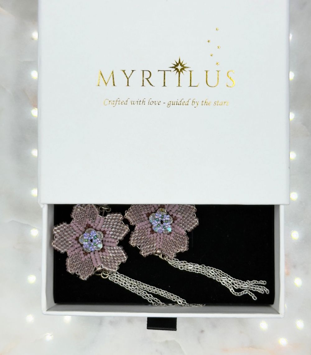 Myrtilus Sakura Whisper captures the lightness of cherry blossoms drifting through a spring breeze. These handcrafted Sakura Whisper earrings feature delicate blooms, each woven from premium Japanese seed beads. Sparkling crystals sit at the center of each flower, catching the light and adding a soft glow.