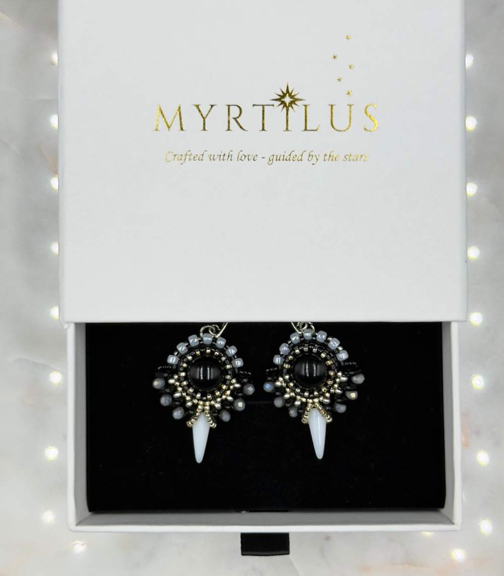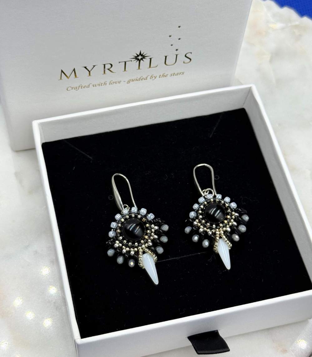 Nocturne Halo captures the beauty of moonlight and shadow in perfect balance. These earrings feature elegant circular forms, handcrafted with a blend of black glass beads and Premium Czech and Japanese seed beads. Every bead is meticulously stitched, creating a design that echoes the quiet rhythm of the night sky.
