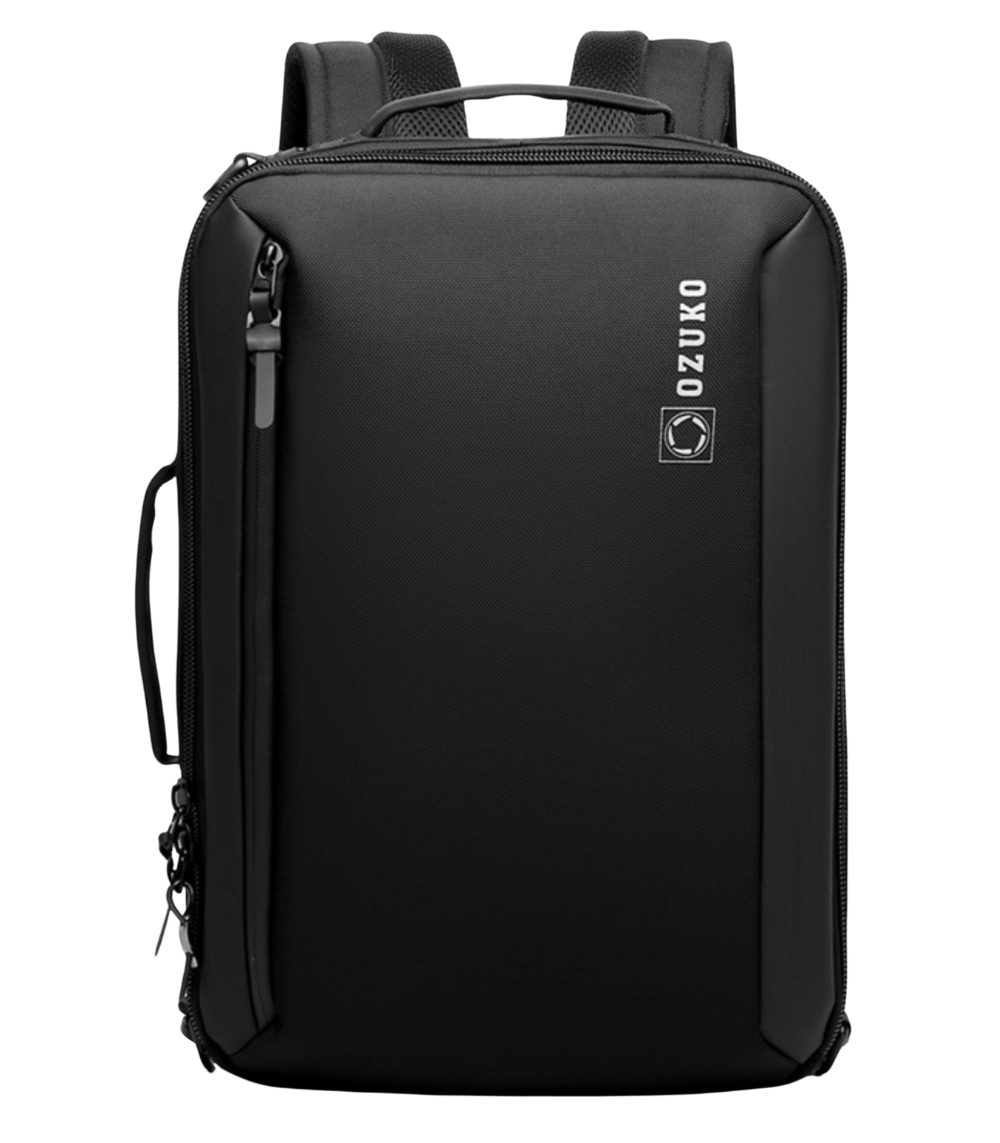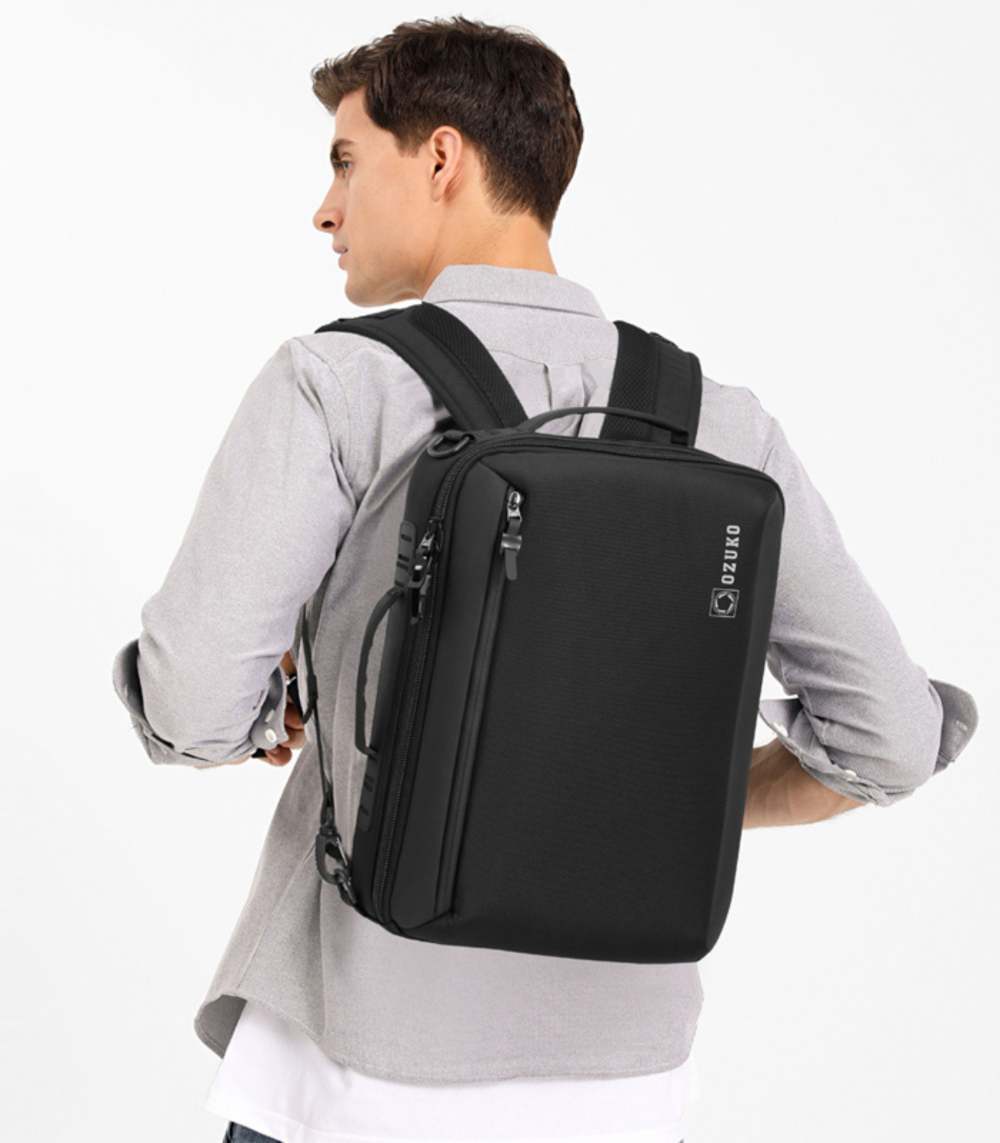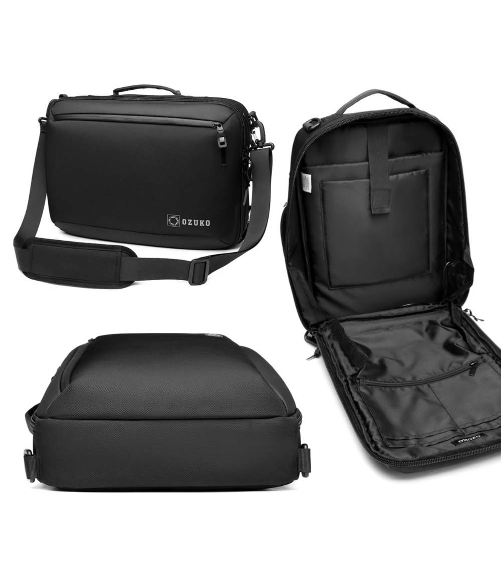 The OZUKO 9490 Water-Resistant City Briefcase Messenger Backpack is a slim 9L water-resistant convertible bag that switches from backpack to messenger for a clean professional look. It features a 90° wide opening with two-way zipper, USB charging port, chest buckle, ventilation design, and reflective logo—ideal for commuting, office, and business travel.