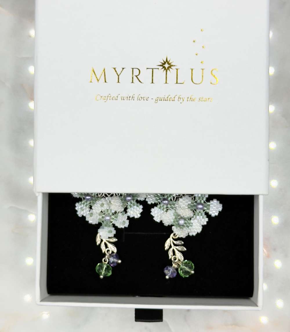 | Myrtilus | Handmade Beaded Earrings | Japanese Beads, S925 Sterling Silver, Crystals | White Floral with Green & Lilac Crystals | 6.5 cm | 3.5 cm | English-style Clasp | For Pierced Ears | Myrtilus Signature Gift Box |