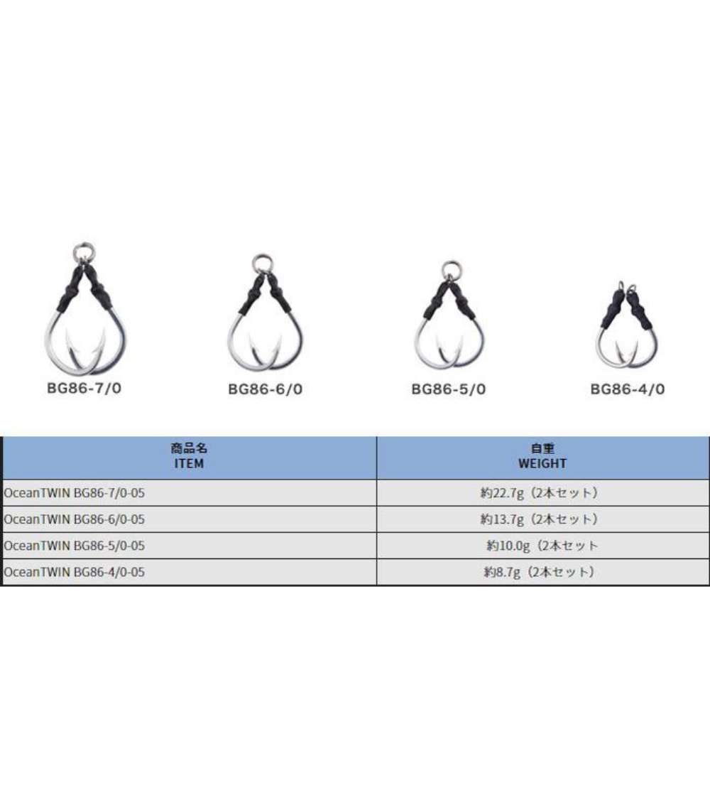 | Studio Ocean Mark | Ocean Twin BG86-6/0 | 6/0 | BG86 – Twin/Single | 13.7 g | 2 hooks |