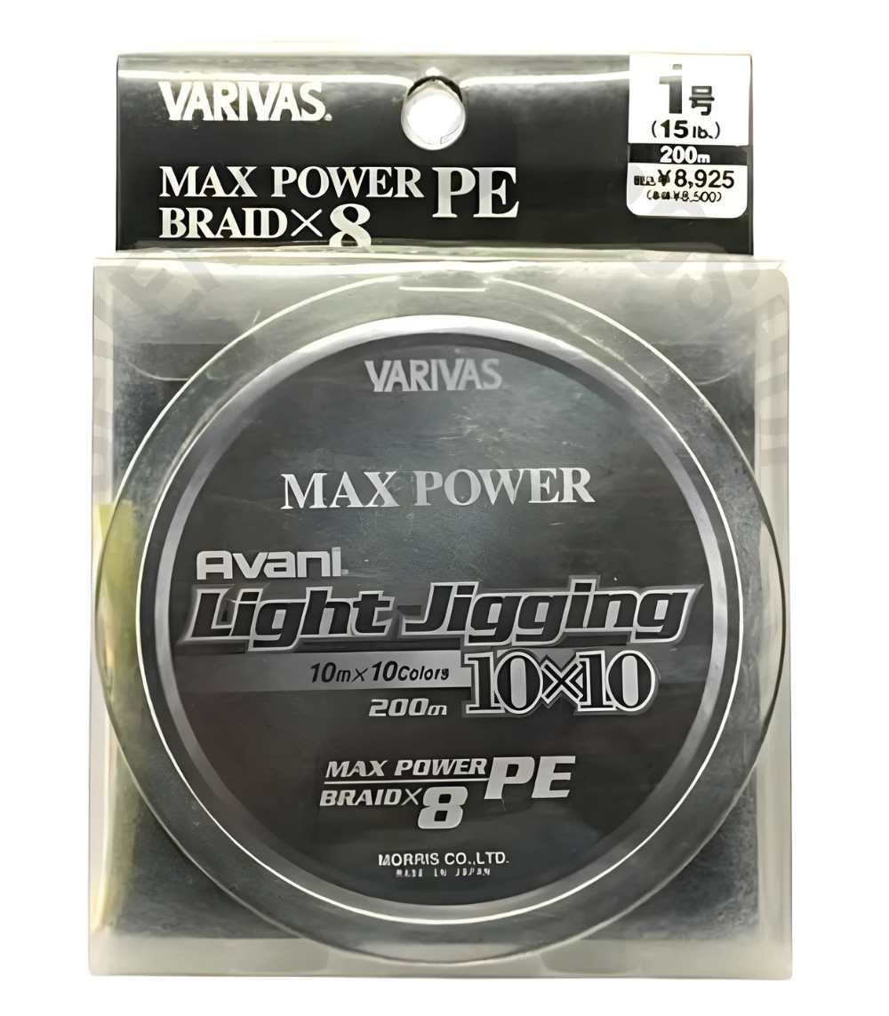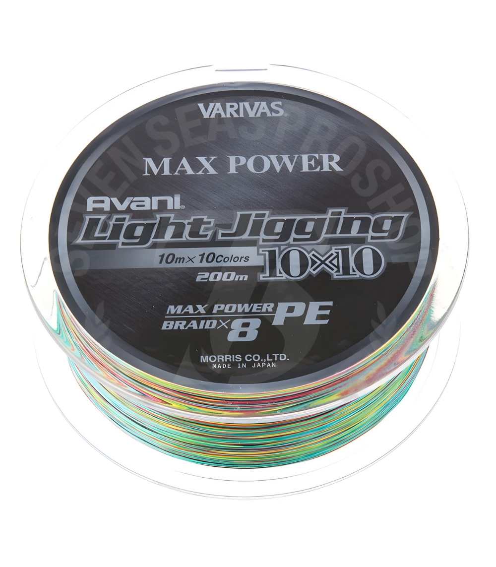 The Varivas Avani 10×10 Light Jigging Max PE 200m – premium 8-strand polyethylene braid with multicolor 10m markings. Available in PE #0.8 (11 lb) and PE #1 (15 lb), designed for precise depth control and smooth performance in light jigging.