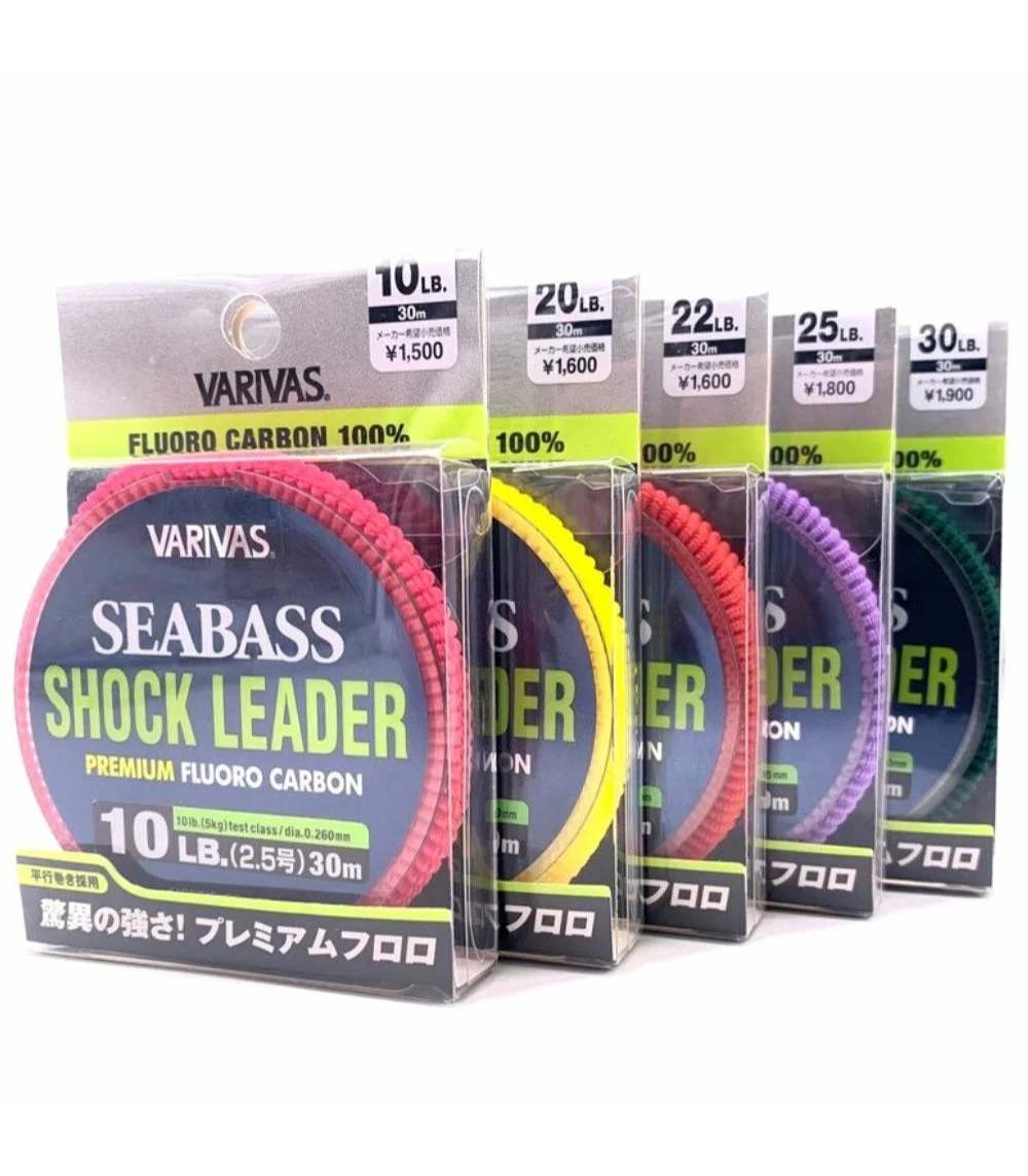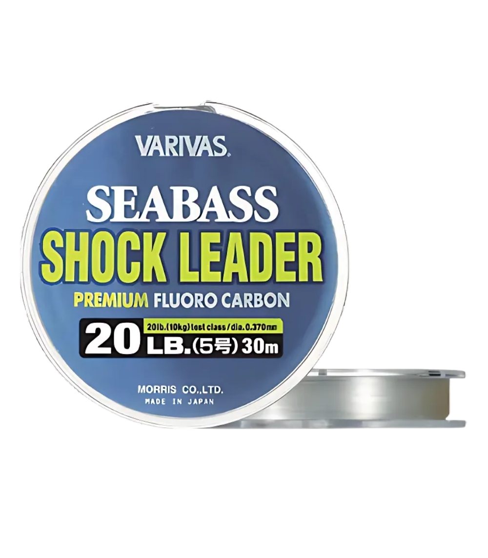 The Varivas Seabass Shock Leader Fluorocarbon 30m – ultra-strong, low-stretch leader with high sensitivity, SP-T coating for abrasion resistance, and natural clear finish for stealth fishing.